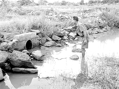 7月17日凌晨,徐闻多个乡镇普降大到暴雨,城北乡也一样。到了当天早上,刘宅村位于宿虎村旁那80多亩的水田变成了泽国,从四周汇集过来的雨水把水田里的农作物完全淹没了。刘玖民老人跟记者诉苦,由于小小的涵洞无法及时把积水排泄掉,导致那片水田受浸10多天。水田里的农作物包括他家尚未移植的秧苗都给浸毁了。