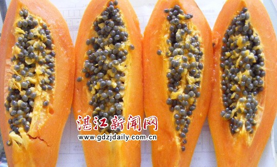 湛江新闻网讯:木瓜又称番木瓜、乳瓜、万寿瓜,其果皮光滑美观,果肉橙黄色,肉厚、汁多且细腻嫩滑、气味清醇芳香, 真是色、香、味俱佳,有着“百益果王”之美称。木瓜除了鲜果生食和蔬菜食用,还可以制果汁及再加工制成蜜饯或作饲料等其它用途,可见其经济效益相当可观。近些年,徐闻农民抓住机遇,不少村庄农民大力发展木瓜种植大面积基地,特别是南山镇槟榔村一带的木瓜种植户,就尝到了种植木瓜发财致富的甜头。