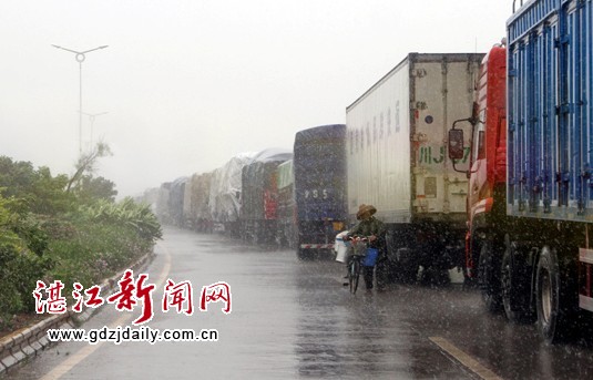 等待在徐闻海安港的货车队伍有四五公路长。图为一个商贩冒着风雨向货车司机推销水果等食物。记者 孙昊声摄