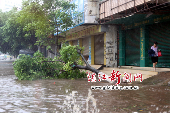 受台风纳莎影响徐闻县城有部分路段积水,图为一位行人从倒伏在积水中的树旁走过。记者 孙昊声摄