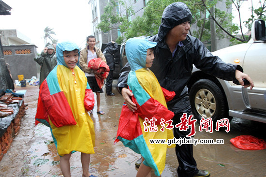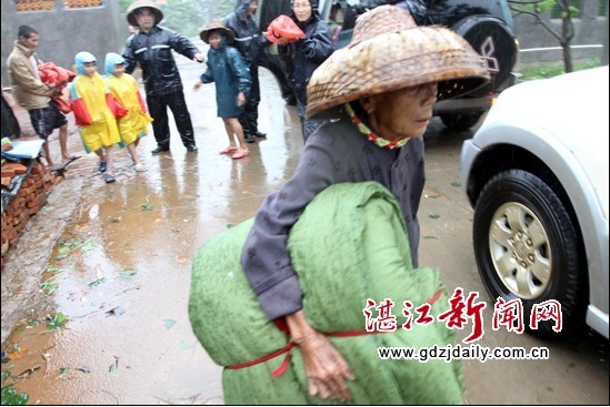 台风纳莎带来了大量降水,同时又遇天文大潮,为保护群众生命财产安全,徐闻白沙村及附近地区有三万多人在相关领导组织下转移到安全地带。图为徐闻县相关领导派车帮助老人孩子尽快转移。记者 孙昊声 摄