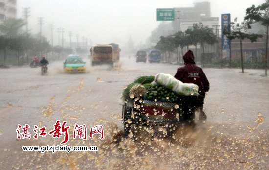 图为受台风纳莎影响,在徐闻县城,一位农民驾驶着满载果蔬的三轮车在积水中艰难前行。记者 孙昊声摄