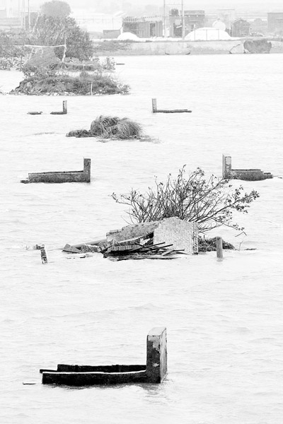 和安镇委书记朱新立即召集三级干部和群众30多人迎风冒雨驾车赶往事发的水头角。朱新没想到事态远超他的意料——虾塘之间的堤坝在海潮的冲击下摇摇欲坠,有些已经分不出边界。远方露出的高角处,一间铁皮屋“孤立”在暴风浪潮中。