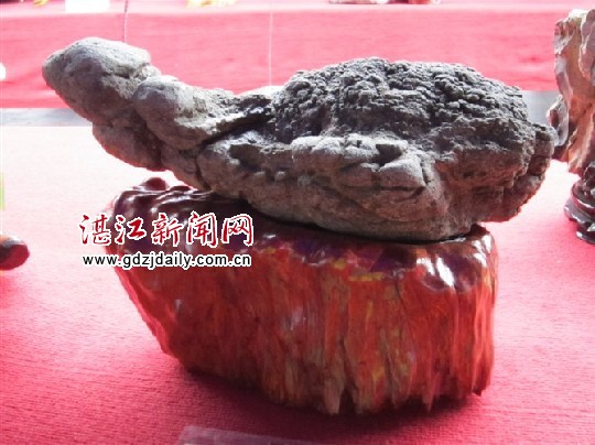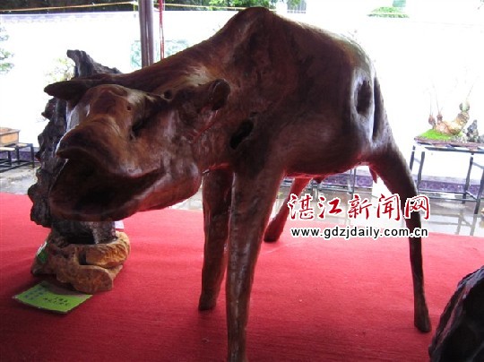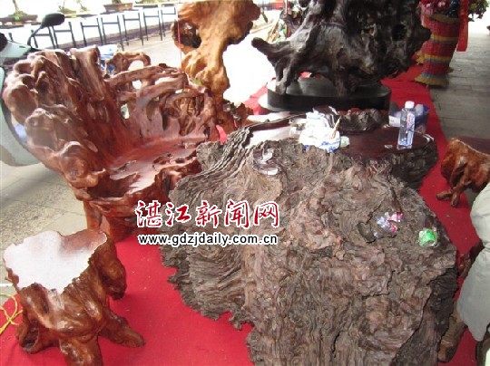 据了解,这次琼州海峡两岸盆景根艺赏石邀请展为期5天,从4日到8日正式向市民开放展出,共展出盆景368盆,根雕艺术作品280多件,赏石166块等,参展的作品有来自海南省的艺术家的作品,也有廉江,徐闻等地的发烧友的作品。笔者在展示会场上看到来自琼州海峡两地的艺术家通过大自然的鬼斧神工后在他们的妙手的雕刻下,一件件神韵不一的根艺作品展示给众人的面前,根艺作品的奇、特、怪、妙 在艺术家的手中表露无遗。据悉展示会场展出的那一套用沉木雕刻而成的茶几价值在20万元以上的哩!