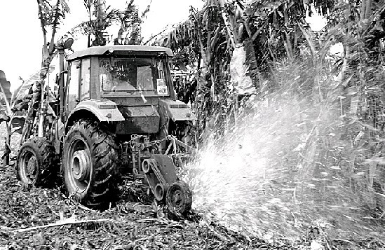 近日,笔者在徐闻县新寮农场看到,一辆胶轮机拉着粉碎还田机正在已收获的蕉园工作,机过之处,香蕉树碎片飞扬(如图),不到一小时,2.8亩的香蕉树、叶全部“化为乌有”,香蕉园被清理成为一块空地。这就是和安镇下尾仔村农民邓尾制造的新型香蕉树粉碎还田机。