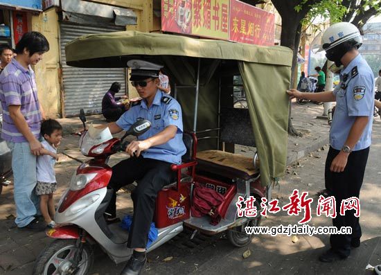 10月19日,笔者随霞山交警大队刘有宽教导员进行了随警采访拍摄,拍到到行动小组民警依法查扣非法营运三轮车的组照。当时,违法当事人正用电动三轮车搭载两名女乘客,沿工农路往建设西路方向行驶,两名行动小组执勤民警巡逻至此,发现目标后逐步逼近,并找准时机将违法电动三轮车“拿下”。媒体记者想采访女乘客时,女乘客转身就离去。而驾车当事人是一位年已六旬的老伯,记者对其采访时,其慌称是搭载两位熟人,后经不起追问说了实情。他说,年纪大了,没有生活着落,又找不到其他活干,就加入了从事非法营运的行列,目前交警查处得紧,防不胜防,许多从事非法营运的三轮车都躲了起来,我年纪大了,斗胆出来找找活,希望交警能“手下留情”。当问到其年纪大了,从事非法营运很不安全,一旦发生交通事故,如何是好?他说,我没有想那么多,只想着赚点钱,若有车敢撞到我,算他倒霉。