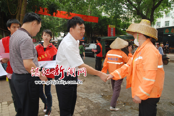 会后,团徐闻县委副书记曾妙苗组织60名青年志愿者上街为正在保洁的环卫工人送上矿泉水,并为市民发放爱护环境卫生宣传资料,倡导共建徐闻美好家园。