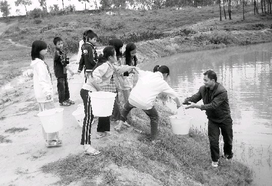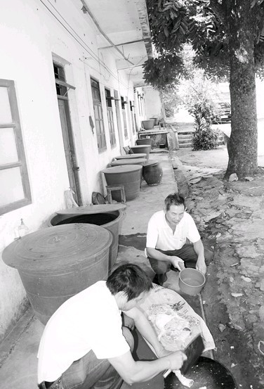 学校的厕所不可能“享受”村里的自来水,学校只好组织学生挑水来冲洗厕所。学校每天分上、下午两次清洗厕所,由四、五、六年级学生轮流到山下的一口2米多深的鱼塘里挑水,每次都出动8-10位学生挑水,因鱼塘的堤较陡,教师甚是提心吊胆。