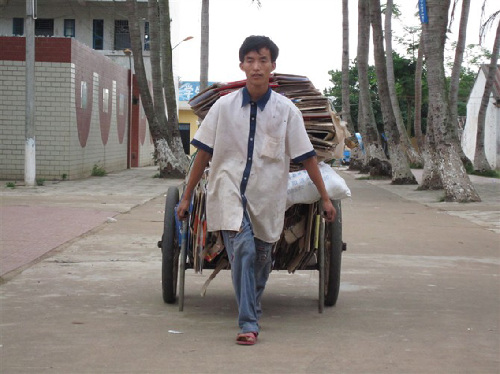 湛江新闻网讯:在徐闻县和安镇的大街小巷和各个居民区,人们经常看到一个貌似十五、六岁的、身材瘦弱、皮肤黑黑的小男人拉着一辆简陋的手推车一边高叫:“收破烂哦!收破烂哦”……