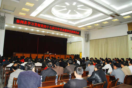 戴吴金荣指出,全会审议通过的《决定》,体现了我们党高度的文化自觉、坚定的文化自信和实现文化自强的宏韬大略,标志着我们国家文化改革发展进入一个新阶段。她强调,广大党员干部按照党中央和省委的要求,以高度政治责任感、使命感,深刻领会十七届六中全会精神实质,认真把握推进“文化强国”战略的必要性和重要性;要采取多样的形式和充分利用载体,迅速掀起学习热潮,切实把思想和行动统一到中央、省、市的决策部署上来,不断推进文化大发展、大繁荣,为加快徐闻后发崛起、实现中华民族伟大复兴做出应有的贡献。该县四套班子成员,县经济开发区主任、书记,县法院院长、县检察院检察长,各乡镇(街道办)书记,县直副科以上单位党政一把手及县委中心组秘书组成员等300多人参加了报告会。