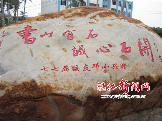 湛江新闻网讯:12月5日,由徐闻县和安中学77届校友——邓小兴(广东省民政学校校长)捐赠的校训巨石在徐闻县和安中学正式落成。