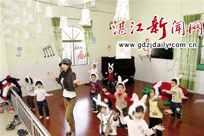 宽敞明亮的课室,愉悦轻快的音乐,10多个活泼的小孩子在幼师陈敏的带领下翩翩起舞……这是日前记者在吴川市振文镇泗岸村幼儿园所看到的情景。