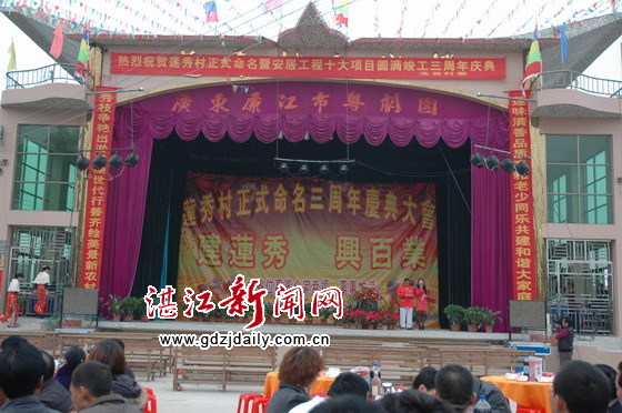 湛江新闻网讯:12月18日,吴川市浅水镇龙首村委会莲秀村举行被命名为文明村三周年庆典大会,该村请来省内著名粤剧团到村演出,设宴席60桌邀请邻近村庄村民到莲秀作客,共同庆祝该村建设文明村的成就。全体村民兴高采烈,热闹非凡,爽过做年例。