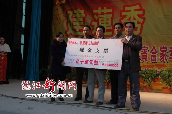 柯水木夫妇在庆典大会捐资三十万现金支持村奖教奖学