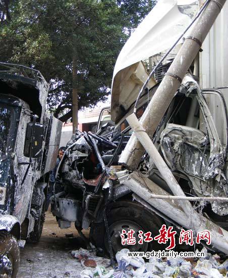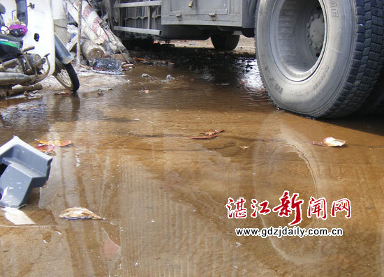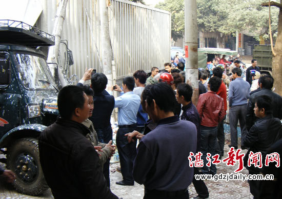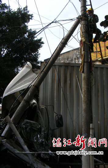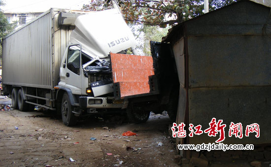 湛江新闻网讯:22日上午10时许,一辆正常行驶开往海南省的五十铃保鲜货柜车至徐闻县徐海路中段下埚小学路口时,突然失控,追尾前面货车,车头玻璃全破碎和左侧车门刮落地上,司机在急乱之中跳下路面,该车偏向右边斜冲,碰断消火栓和电线杆,再撞上农用车,才卡住在街边的一间铁皮屋外,幸好无人员伤亡。