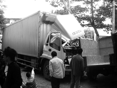 记者赶到现场看到,一辆赣F车牌的大货车停靠在国道边,其尾部保险柜稍有变形。10米远处,一辆琼A车牌的小货车与一辆无牌小卡车“拦腰”撞在一起,小货车的车头严重损毁,小卡车车卡变形,车后一个用铁皮搭成的小卖部被撞凹了一大块(如图)。
