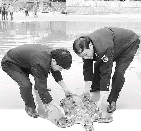 徐闻渔政大队教导员陈辉国带领渔政人开车赶到龙塘赤坎村码头,与渔民窦永富一起对海龟身体进行检查,并丈量和鉴定海龟的年龄。经渔政人员丈量,这只海龟身长0.95米,宽0.68米,重达55公斤。该海龟壳厚黑秃,是一只雄龟,估计这只海龟在海中生活近100年。