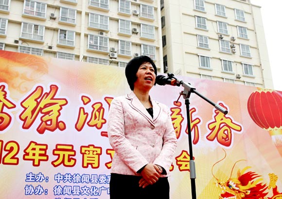 县委常委、宣传部长戴吴金荣宣布舞龙舞狮表演活动正式开始