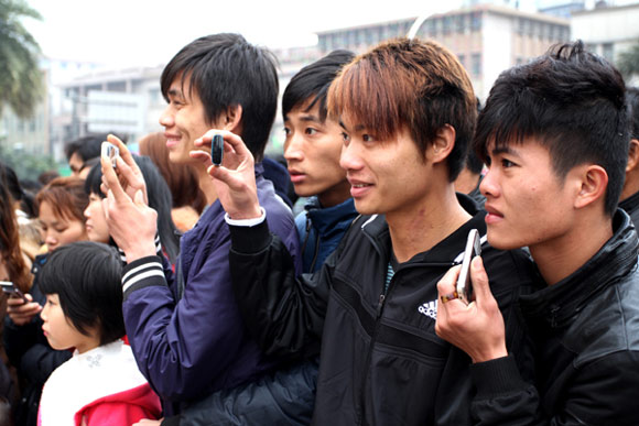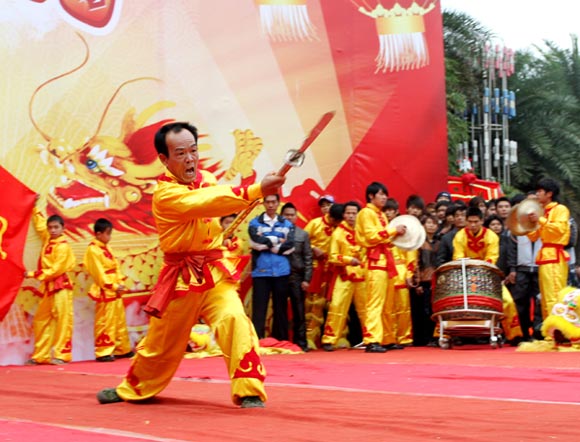 当天上午9时正,戴吴金荣宣布舞龙舞狮表演活动正式开始。随后,锣鼓喧天,鞭炮齐鸣,龙狮共舞,两条金黄色的巨龙在龙珠的引领下上下翻飞,金龙抱柱、逗珠滚龙;还有两头装扮得很“帅气”的大黄狮在巨龙前蹦来蹦去,眼睛眨来眨去,显得十分可爱,博得围观市民的一阵阵喝彩,使整个文化广场都能感受到节庆的热烈气氛。