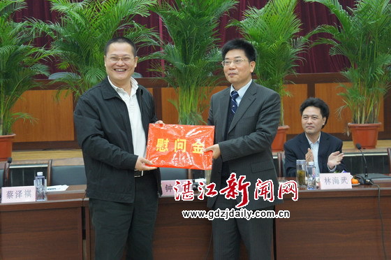 徐闻县委书记、人大常委会主任钟力给湛江农垦局党组书记、局长蔡泽祺送上慰问金。
