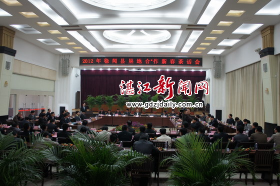 湛江新闻网讯:2月3日,徐闻县在会务中心一楼召开垦地合作新春茶话会,县领导钟力、林海武、符贤、李乐、林青、吴宏望等及有关部门、乡镇领导与湛江农垦局领导蔡泽祺、欧阳艳、何时盛、黄国强、陈永光等以及机关处室负责人和徐闻垦区领导欢聚一堂,共贺新春,共叙兄弟友情,共商发展大计。双方领导表示,今后将一如既往地加强沟通和联系,加强理解和支持,加强全方位合作,有效理顺各种关系,力争把垦地发展融为一体,携手共进共创辉煌。