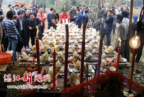 天一亮,整个红坎村便沸腾起来:锣鼓喧天,八音齐奏,鞭炮声声,此时此刻,村民们都不约而同提着煮好的供鸡集中到村中古庙旁的小广场,用盘子装好摆放在一起供奉举行祈福仪式(俗称“百鸡宴”)。仪式过后,就是最为热闹的游村活动,将闹元宵活动推向高潮。游村时,不论男女老小,都热情高涨参与,举着彩旗,敲起锣,击响鼓,吹起唢呐,集结成长长的队伍穿梭绕游于村中的村道小巷。霎时间,众音同鸣,与鞭炮声、欢笑声汇合成一曲曲动听的交响乐,响彻云霄,整个红坎村成了一片欢乐的海洋。