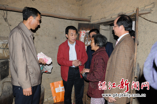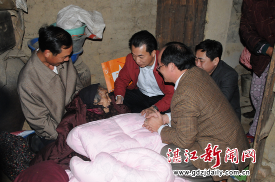湛江新闻网讯:吴川市新闻中心消息 记者 曾超燕 摄影报道:2月7日中午,吴川市委书记曹兴从当天的《湛江日报》上,看到了关于振文镇五教岭村94岁孤寡阿婆陈杜英无人照顾的报道后,立即组织该市民政局、振文镇等有关部门领导前往探望,给孤寡阿婆陈杜英送上棉被、羽绒服及慰问金。吴川籍热心人士林艺受市比干文化促进会的委托,向孤寡阿婆陈杜英捐赠5万元的建房资金。当天随同探望的还有吴川市委常委、市委办主任吴松江,副市长李志鹏等。