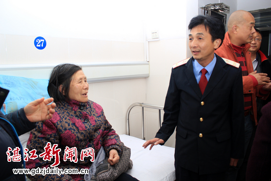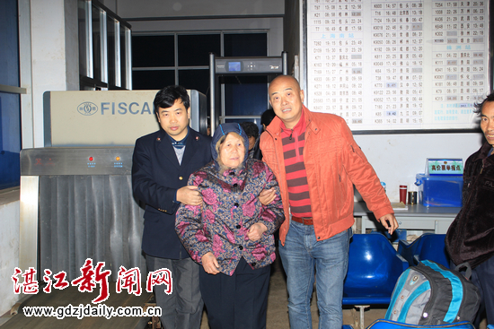 2月5日16:30分,病患已初步显现,但仍坚持上车,上车后病情恶化,经家属同意在徐闻站下车接受治疗。经人民医院诊断,汪女士患的是脑血管梗塞,暂时性失去言语和行动能力,且因年龄过大,需住院观察和治疗。医院里,陪护的姨女婿激动地说:“谢谢你们,是你们的及时帮助才挽救了我姨岳母的生命,是你们的存在才让我们在这人生地不熟的地方有了主心骨,你们就像我们的亲人。”“不用谢,这是我们应该做的,在生命面前,我们义不容辞。”车站党总支书记艾杰初在看到病人已经得到治疗后,舒心地说,“明天我们再来探望大妈……” 经过两天的治疗,汪女士的病情基本稳定下来。