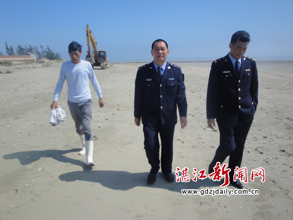 据了解,2月15日上午,徐闻县海监大队梁玳铳大队长带领海监执法人员执行海域巡查时,发现新寮镇×村村民陈×非法开发该镇无人居住岛——雷打沙岛,该村民雇用一部挖土机正在进行挖养殖场管道施工作业,执法人员在现场检查该工程没有任何海域使用权证书,属非法开发,于是,立即勒令停止施工。