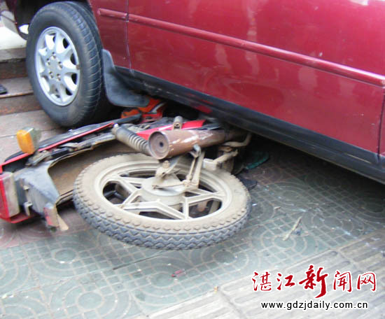 湛江新闻网讯:19日下午17:30时,位于徐闻县东方一路东段突发一宗车祸。一辆横过马路的枣红色小轿车失控撞倒一辆红色二轮摩托车,造成一家3人不同程度受伤,事后,送医院医治。
