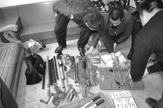 据犯罪嫌疑人初步交待,他们这一年多来,在梅菉城区盗抢摩托车、手机财物一批,并交待在城区新建路四巷一出租屋藏有作案用的枪支。特警中队长又立即组织伏击组人员前往出租屋搜查,搜出可连续击射5发子弹的来福枪2支,子弹15发,水雷5枚,开山刀、匕首等各种作案工具一批,以及被盗摩托车汽车牌13副和枪支散件等一批(如图)。