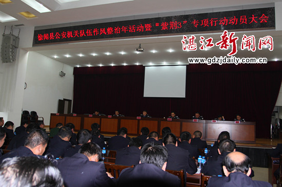 湛江新闻网讯:3月1日下午,徐闻公安机关队伍作风整治年活动暨“紫荆3”专项行动动员会召开,深入贯彻落实省 “三打两建”工作会议与市“三打”工作会议精神,在全县部署公安机关作风整治年活动与开展打击欺行霸市、打击制假售假、打击商业贿赂等打黑除恶“紫荆3”专项行动。