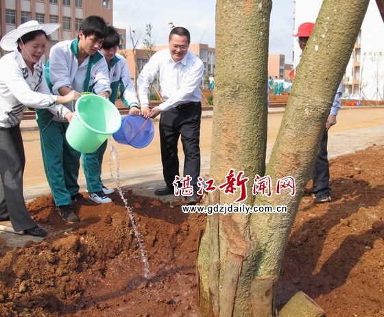 当天,徐闻县实验中学比平时都热闹,徐闻县领导与学校师生一起挥锄抡铲、培土浇水,一株株新树竖立在崭新的校园里,正在改变着那里的面貌。据了解,当天共植树2000株,有白玉兰、樟树、大叶紫薇、小叶榄等等树种。