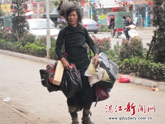 湛江新闻网讯:4日,徐闻县城有一个“犀利哥”在东平二路“巡视”街道。该犀利哥身高接近1米8,他那深邃的眼神,神乎奇迹的搭配,还有身上不算简单的“行囊”,还有那个性独特的头发,吸引着众人的眼球!