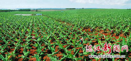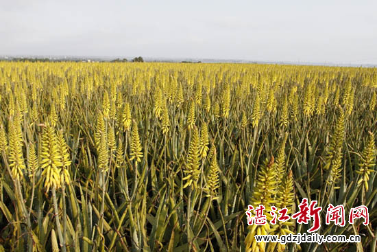 湛江新闻网讯:层层叠叠的香蕉林遍布着,青翠连天,摇滚成绵延的绿浪翠涛,香蕉园内一条条黑色塑料管正往外喷射着水珠,形成整片漂亮的水雾,放眼看去,整片香蕉园都被这薄雾环抱着。众多小小南瓜像个小胖娃娃躺在园地里。青翠色的菠萝叶直指天空,密密麻麻的叶子保护着一个个紫红色的小菠萝。更漂亮的是一大片一大片的芦荟花,全是黄色的,黄的耀眼,微风吹来,一丛丛、一株株,左右摇摆,像一幅幅画卷在风中飘动,真让人赏心悦目。园地里黄瓜秧分叶、青椒吐绿、玉米吐须等一园连着一园的,一片连成一片,组成生机勃勃而又五彩斑斓的瓜果蔬菜园。