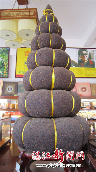 湛江新闻网讯:13日笔者在徐闻县城办事时,在一间茶庄里看到一座由巨型普洱茶组成的九层茶“塔”。