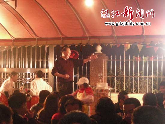 湛江新闻网讯:13日傍晚,是吴川长岐镇黎屋村“年例”。“广州魔王”谢锦雄应邀走进黎屋村农家,近距离表演魔术,与村民共庆“年例”。