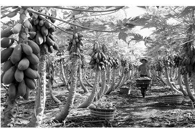 徐闻农业发展方式的转变要追溯到1998年。当年,广东省委在徐闻召开雷州半岛改水治旱现场会,提出了“扩库硬渠上井群,改善生态调结构”的治旱方向。随后,徐闻全境展开了全民治旱行动,其中打井抽水灌溉成为广大农村最广泛采用、最有效的治旱手段之一。几年间,徐闻近100万亩的耕地上打了大小口径机井。随着汩汩清泉地下来,干裂的田野变绿了,大面积的北运菜、香蕉等高效作物代替了原先只能旱地种植的低效作物,农民大幅增收。