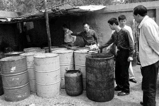 该加工点位于大岭村一间民宅内,占地约200平方米。执法人员进场检查时,发现该加工点内有一名工人正在将一桶鱼内脏进行加热。现场有12个装满液态油脂的蓝色铁桶。该加工点卫生环境极差,现场散发一股恶臭。该加工点还放有一桶疑似潲水油原料。