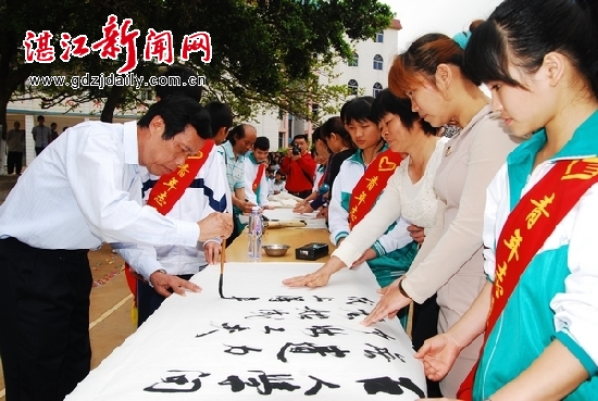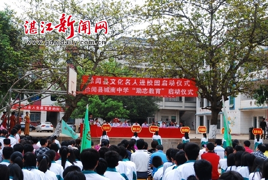 湛江新闻网讯:为了尽最大努力挖掘学生潜质,培养兴趣与爱好,增强学生信心,提高学生能力,让每位学生健康成长,营造好学上进、和谐安定的校园环境。3月21日上午,徐闻县城南中学举行文化名人进校园暨“励志教育”活动启动仪式。县委常委蒋柯煌,原县委常委、县书法家协会主席杨世金,湛江日报民生中心副主任简陈明,县委宣传部副部长、广播电视台台长、县作家协会主席李明刚,县教育局党组书记刘养,县委党校常务副校长、县教育局副局长潘建义及县文联、南山镇、县职业中学等单位领导以及文化、教育界文化名人参加了启动仪式。