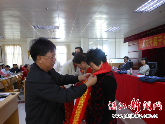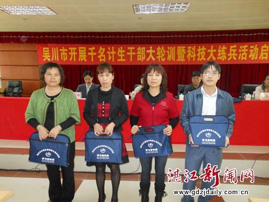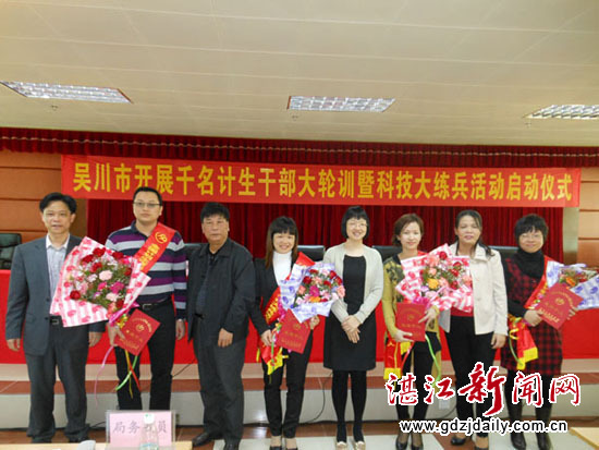 在当天的启动仪式上,吴川市副市长陈冰湖、湛江市人口计生局领导蔡广文、梁茂玲等分别向获得全国计划生育科技大练兵活动先进个人的郭土、李茂华、陈海英、郑楚丽、李妍冰等5位同志颁发证书、披彩带、送鲜花等,并向学员代表赠送有关学习书籍和笔记本等,吴川市人口计生局局长陈志雄分别向市计生服务站和各镇(街)服务所授计划生育科技大练兵活动旗。