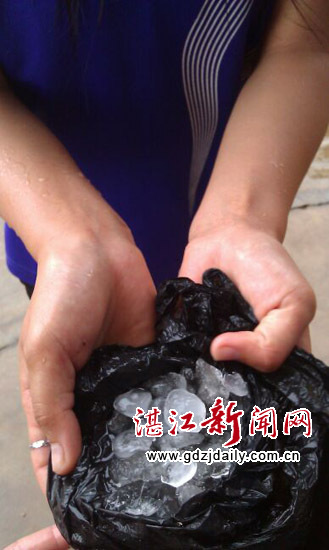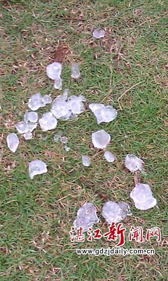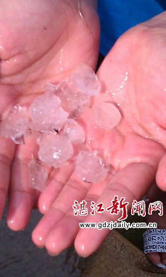 湛江新闻网讯:4月5日下午3时45分,徐闻县锦和镇下了一场骤雨,在大雨来临前的3时45分前后持续下降了10分钟之久的冰雹 ,就这么短短的10分钟时间内,锦和镇的市民到处可以看到晶莹剔透的碎冰般的冰雹。从笔者冒雨在锦和中学的草坪上“拾获”的冰雹碎块中,用称量称出最重的一块重量达30克。