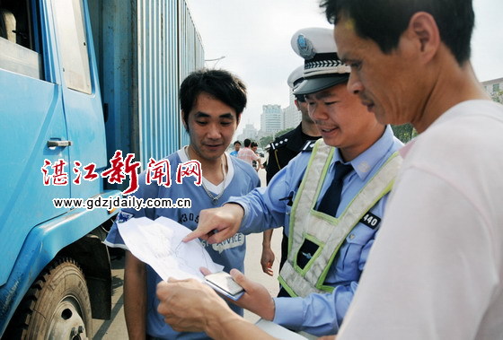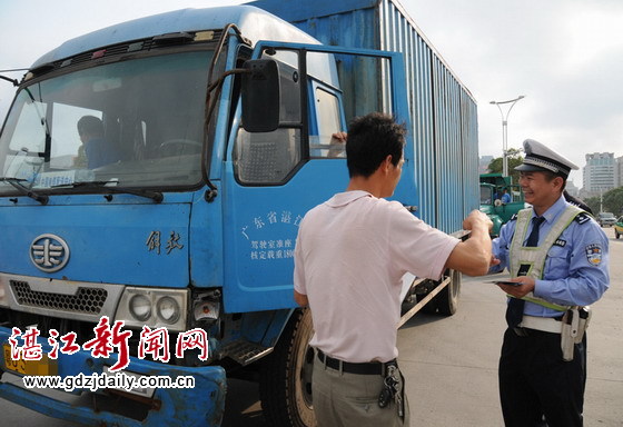 湛江新闻网讯:经过一个月的警告教育期,从本月1日起,市公安交警部门开始对违反“限行”的中型及以上货车加大整治查处力度,仅6日下午,霞山大队勤务二中队就查处了17辆无视禁行标志闯进“限行”线的大货车,并依法予以罚200元、记3分的处理。