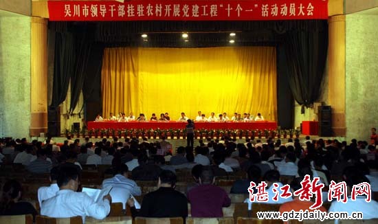 湛江新闻网讯:为加强基层组织建设和各级领导班子尤其是主要领导干部队伍建设,探索建立机关干部尤其是领导干部经常性联系基层和服务群众的长效机制,进一步发挥基层党组织推动发展、服务群众、凝聚人心、促进和谐的战斗堡垒作用,为实现“打造湛茂经济发展圈战略高地、努力建设幸福吴川”提供坚强的组织保证,从现在起,吴川市决定开展为期两年的领导干部挂驻农村开展党建工程“十个一”活动。