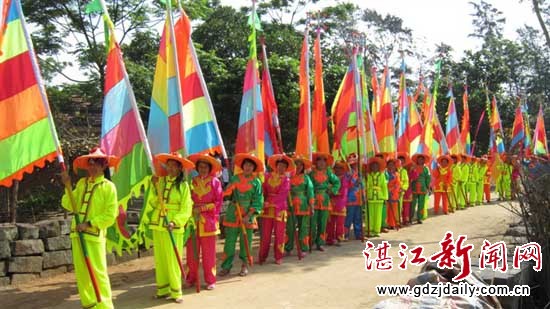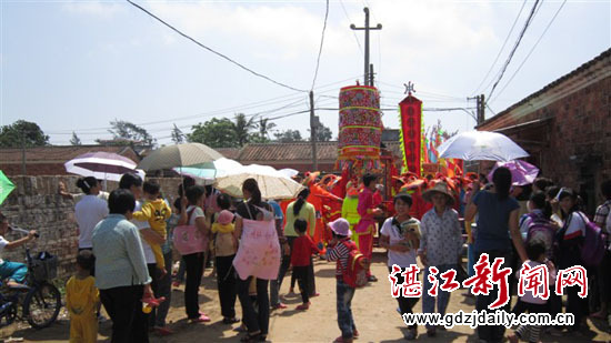 湛江新闻网讯:“有海水处有华人,华人到处有妈祖”,农历三月十九〔4月9日〕是妈祖的寿诞,徐闻县和安镇后宫村这个以捕鱼为主的海边渔村隆重举行庆祝游行活动,绵延数百米长的彩旗队伍穿梭在后宫村的各条路巷中。在八音锣鼓的伴奏下,舞狮表演精彩,现场热闹非凡。