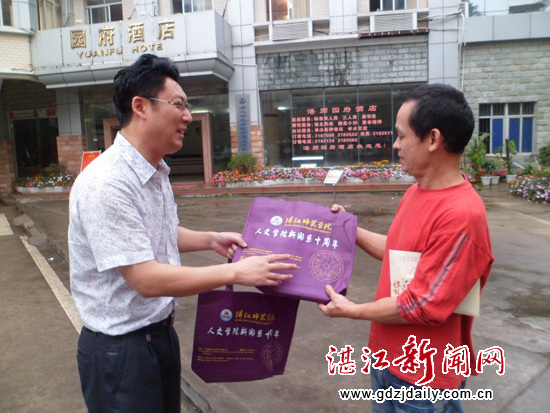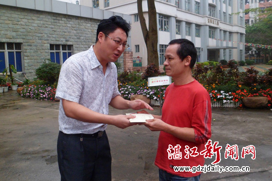湛师新闻系主任姚远老师得知此事后,主动发动新闻系师生共同来关注此事,并大力配合《红土情》义卖活动。在新闻系师生共同努力下终于义卖筹下来一千来元。4月10日下午,新闻系主任姚远老师代表新闻系师生将爱心捐助的筹款如数交到好丈夫赵坚手中。姚老师说,钱虽然不多,但零零碎碎的人民币代表着我们新闻系师生对社会的关注和这对感人夫妇的小小爱心。赵先生也表达了对湛师新闻系师生的感激之情,感谢所有帮助了他们的热心人士,同时,他还祝愿湛师新闻系越办越好。