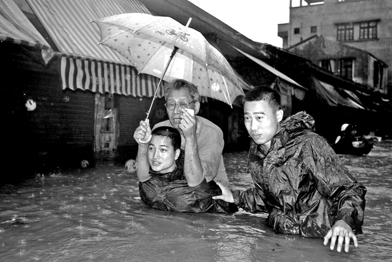 昨日上午9时40分,吴川公安消防大队接到110指挥中心报警后,消防中队快速反应,立即出动1辆消防车8名消防官兵前往事故地点进行救援。带队的王星松副中队长带着战士背起被困者(如图),涉水迅速向安全的地带转移。待被困者安全后,王星松毅然带领战士返回出事地点,继续帮群众抢救物资。整个救援行动持续了一个多小时。