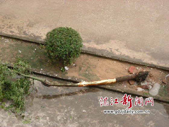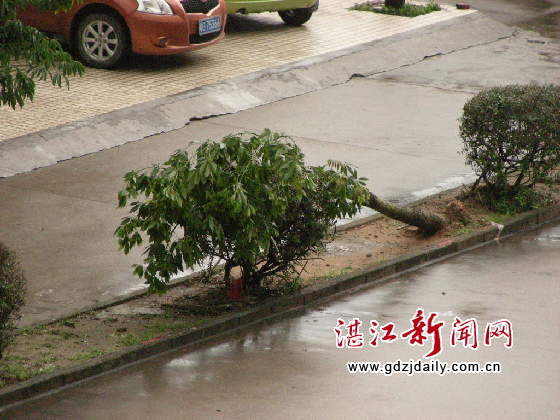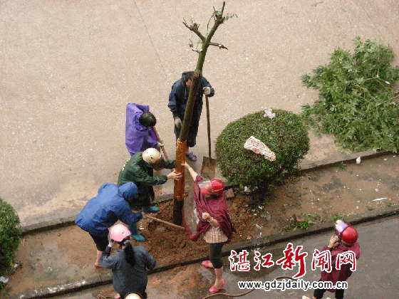 记者在吴川市区广沿路看到,在18日的雷雨大风袭击下,不少路树被刮倒,有的甚至被连根拔起。18日下午,吴川市园林管理处出动车辆和人员,对被风刮倒的路树进行清理和扶植。经过奋战,被风刮倒的路树重新竖起在广沿路两旁。