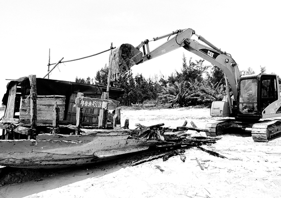 琼州海峡北岸海区定置作业渔船被拖上岸边拆解。 记者 简陈明 通讯员 邓业 摄