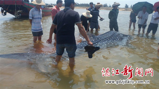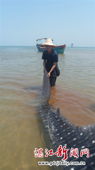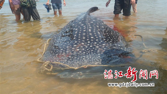 湛江新闻网讯:近日,徐闻县角尾乡放坡村渔民在位于北部湾和南海交汇处〔当地人叫分水线〕的海面上作业时,捕获一条误入网中的大鲨鱼。